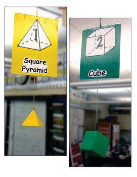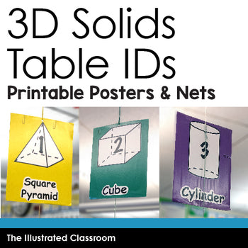 Free math 3D solid figures table IDs. The download paper nets for cubes, cones, pyramids, rectangular prisms, and cylinders. Print them on colored paper for some extra pop and color-coding.