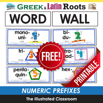 set of Greek & Latin Roots word wall cards for pocket charts, literacy centers, bulletin boards, and a quadrillion other uses! These cards illustrate the meaning of the numeric Greek & Latin roots that we find in academic words in Math, science, ELA, and social studies! Words like unity, bisect, triangle, quadruped, pentameter, and more!