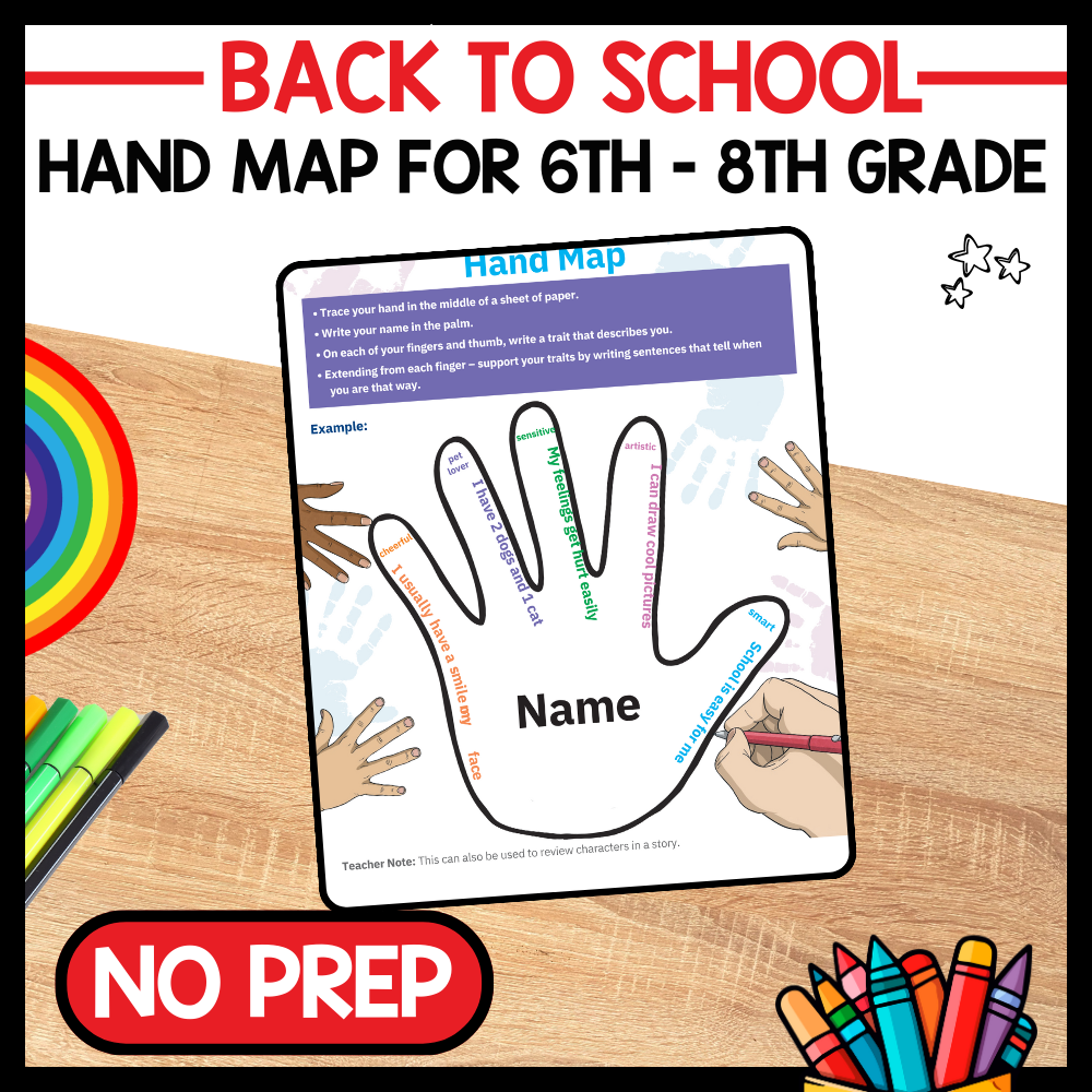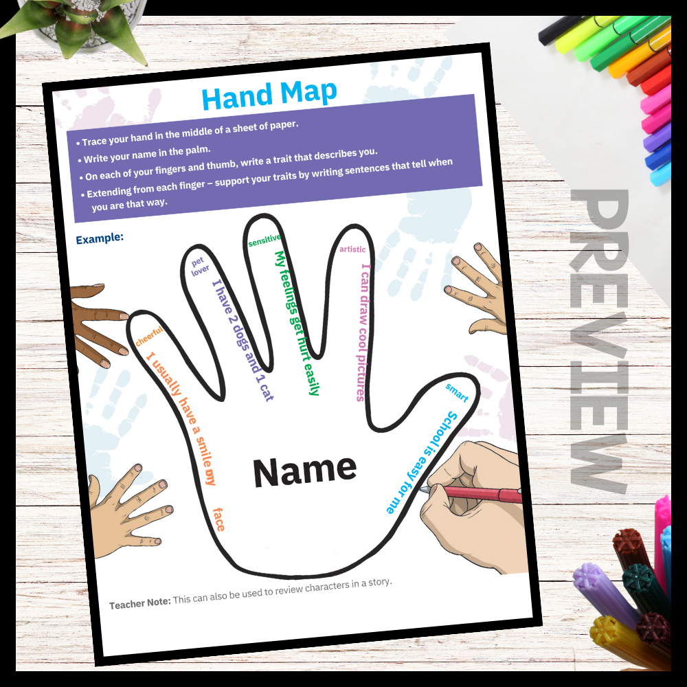This hand map activity is an excellent, welcoming activity for the first week of school. Students introduce themselves using their handprints and character traits. The finished pieces create wonderful wall or bulletin board displays in the early days of school.