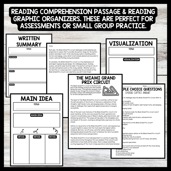 Different options provided- multiple choice, written response or graphic organizers to focus on individual skill.