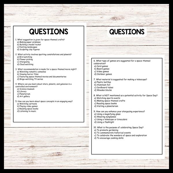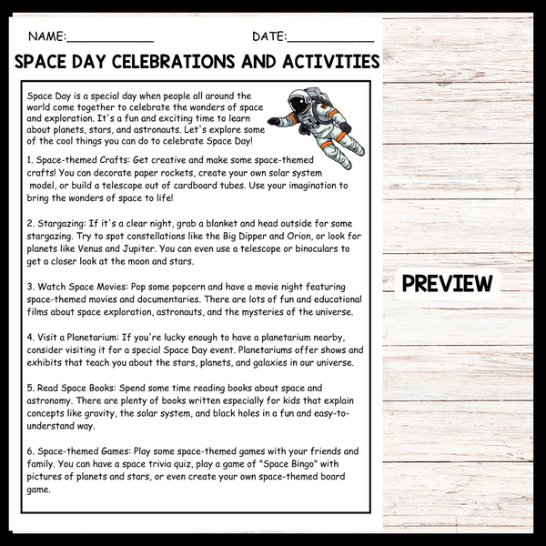 - "SPACE DAY CELEBRATIONS AND ACTIVITIES" SPACE DAY Reading Comprehension