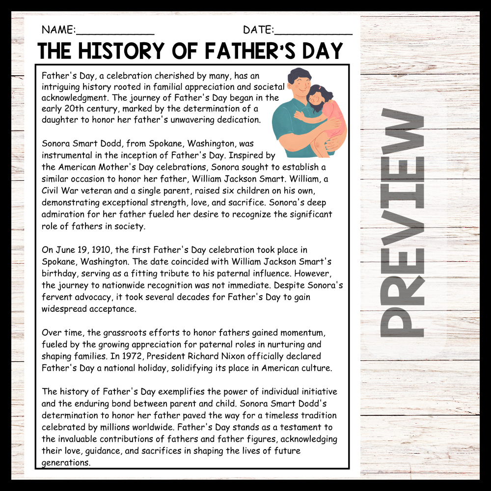 Sonora Smart Dodd's initiative to establish Father's Day in honor of her father, William Jackson Smart, highlights the importance of paternal influence and sacrifice in family life. Despite initial skepticism, her determination led to the first Father's Day celebration in 1910, eventually gaining national recognition in 1972. This historical journey underscores the significance of recognizing and appreciating the role of fathers and father figures in society, showcasing the enduring bond between parent and child. Teachers can use this story to illustrate themes of gratitude, family values, and the power of individual action in shaping cultural traditions.