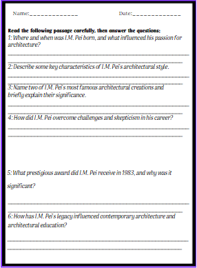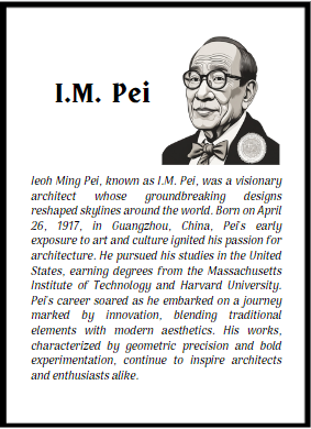 I.M. Pei Biography - Reading Comprehension: I.M. Pei was a renowned Chinese-American architect, born in 1917 in China. He moved to the U.S. to study architecture at prestigious institutions like MIT and Harvard. Known for his modernist designs, Pei's iconic works include the glass pyramid at the Louvre in Paris, the Bank of China Tower in Hong Kong, and the John F. Kennedy Library. His designs blend traditional influences with contemporary style, making him one of the most influential architects of the 20th century.
