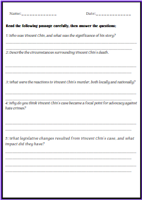 AAPI Heritage Month Vincent Chin Biography - Reading Comprehension & Questions