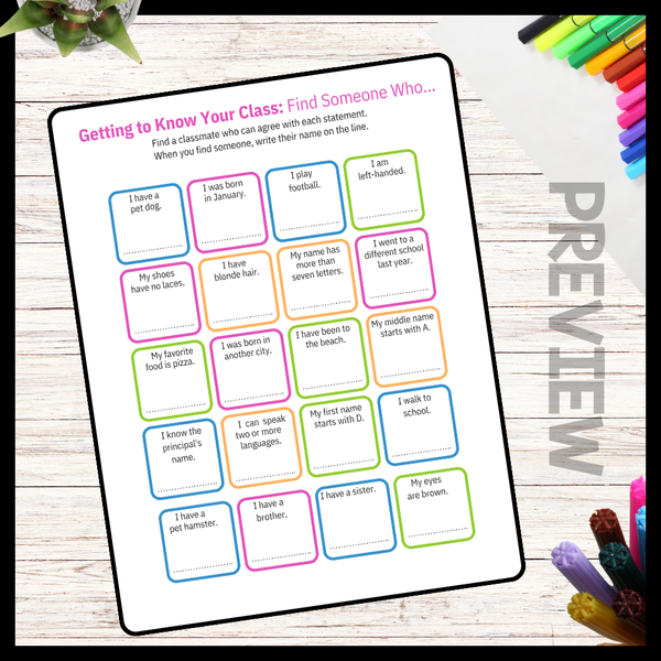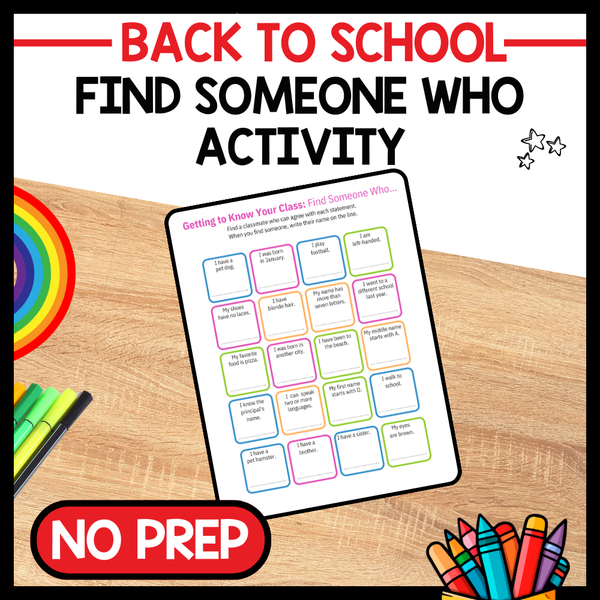Looking for a fun way to break the ice and get 1st to 5th grade students moving and interacting during the back-to-school season? Look no further than our Find Someone Who Activity. This activity encourages students to stand up, mingle with their peers, and find someone who fits each description on the board. It’s a game designed to shift their focus from first-day nerves to communication, creating a welcoming and enjoyable learning environment.
