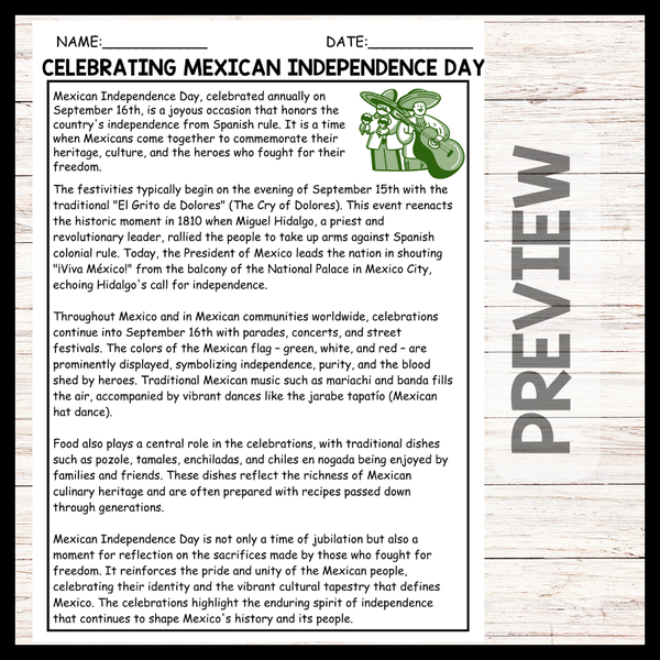 - Celebrating Mexican Independence Day Reading comprehension and Questions