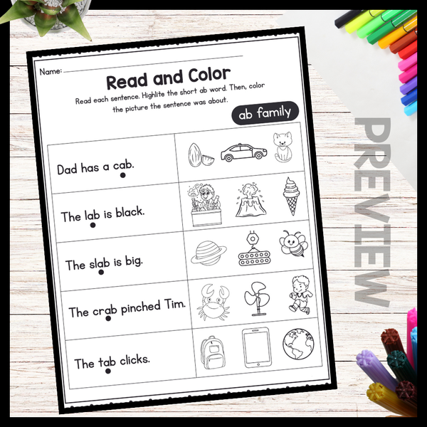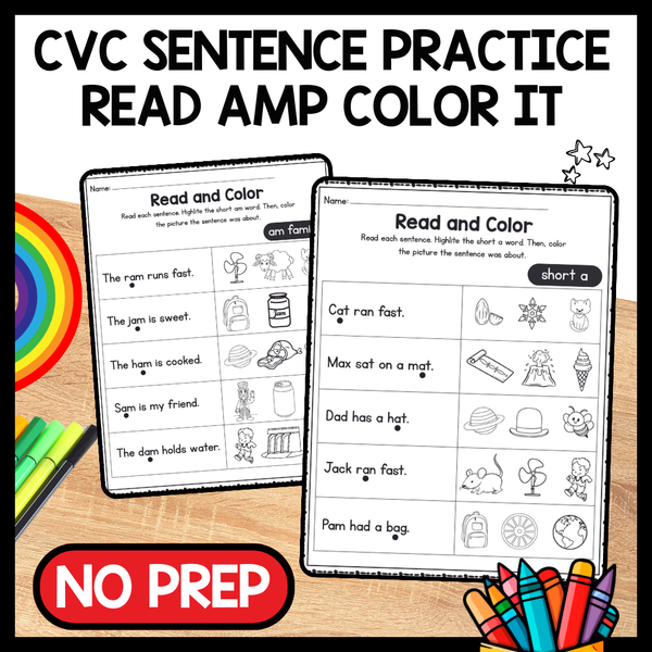 Improve your child's reading skills with CVC Sentence Practice. This activity book encourages reading through CVC sentences and coloring, making it fun and engaging for children. Help your child develop their literacy skills while having fun!