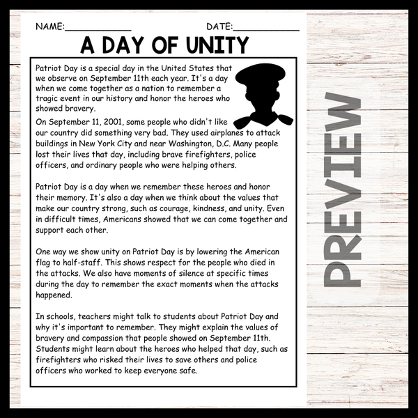 - Patriot Day A Day of Unity Reading comprehension and Questions