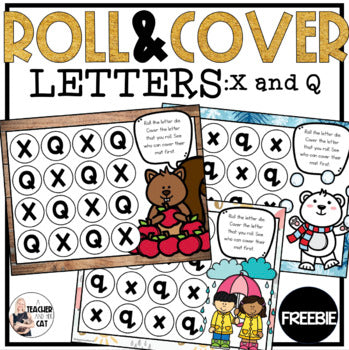 These roll and covers are perfect for letter recognition practice. Play in pairs or one on one with a child to assess their letter understanding. This free set covers the letters Q and X. All of the mats use these letters. The full versions include 6 letters/sounds per mat and 4 mats per season instead of 2.