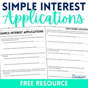 This two-page worksheet presents various scenarios, from bank deposits to financing cars, offering students practical exercises in using the simple interest formula.