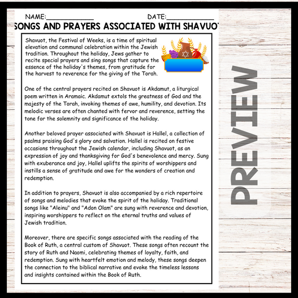- "SONGS AND PRAYERS ASSOCIATED WITH SHAVUOT" SHAVUOT Reading Comprehension