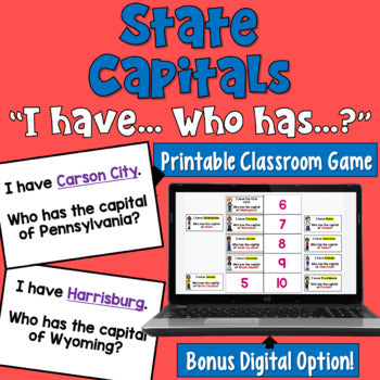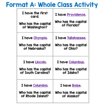 This game contains 51 cards naming the state capitals. This is a great activity if you are looking for an opportunity to engage your entire class! Give each student 1 (or more) card(s). Have the student with the first card begin by reading their card, and game unfolds!