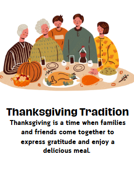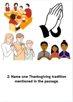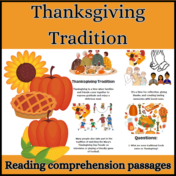Thanksgiving Tradition Reading Comprehension passages offer students engaging stories and information about Thanksgiving customs, history, and family traditions. These passages are typically short, designed for various reading levels, and include questions that help students develop reading skills, such as main idea, details, and vocabulary. Topics may include the history of the first Thanksgiving, the significance of giving thanks, and modern family traditions like cooking together and watching the Thanksgiving Day Parade. Each passage comes with questions to encourage critical thinking, comprehension, and discussion about what Thanksgiving means in American culture.