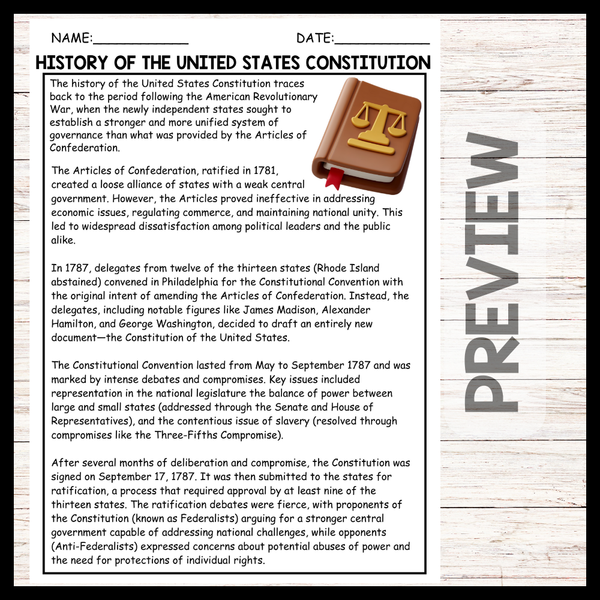 Through this passage, educators can highlight the significance of the Constitutional Convention in Philadelphia, where key Founding Fathers like James Madison, Alexander Hamilton, and George Washington crafted the Constitution. Students can explore the debates and compromises that shaped the document, including the solutions to issues like representation in Congress and slavery. Understanding these historical events helps students grasp the complexities of nation-building and appreciate the foundational principles of American government, including federalism and the balance of powers.
