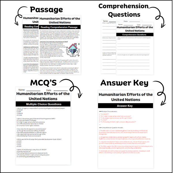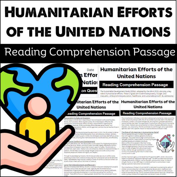 Engage your students with this comprehensive reading comprehension passage on United Nations Day: A Global Celebration of Unity and Peace. This resource provides an in-depth look at the history and purpose of the United Nations, focusing on its formation after World War II, the key roles it plays in global peacekeeping, human rights, and the Sustainable Development Goals (SDGs).