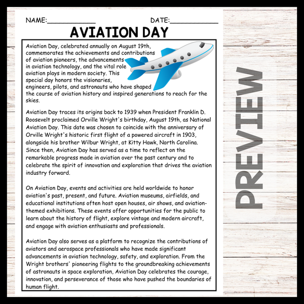 This passage provides an overview of Aviation Day, its origins, and how it celebrates the advancements in aviation. It is helpful for teachers to use in class because it offers a concise and engaging summary, making it easy for students to understand the significance of the holiday and the contributions of aviation pioneers.