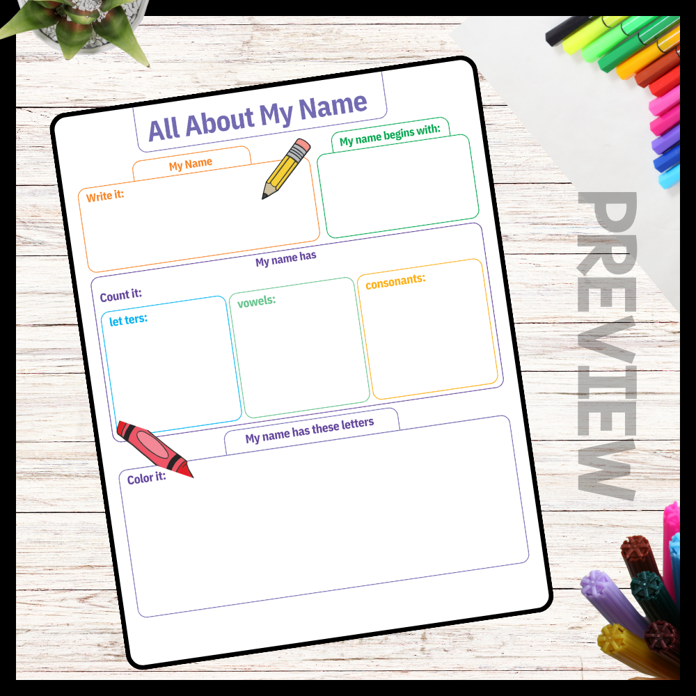 This activity is designed as an enjoyable back-to-school exercise for children to celebrate their individual names! Kids can write their names, identify the first letter, count vowels, consonants, and total letters, and even color each letter in their name.