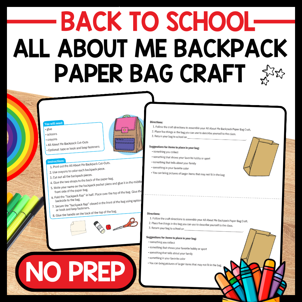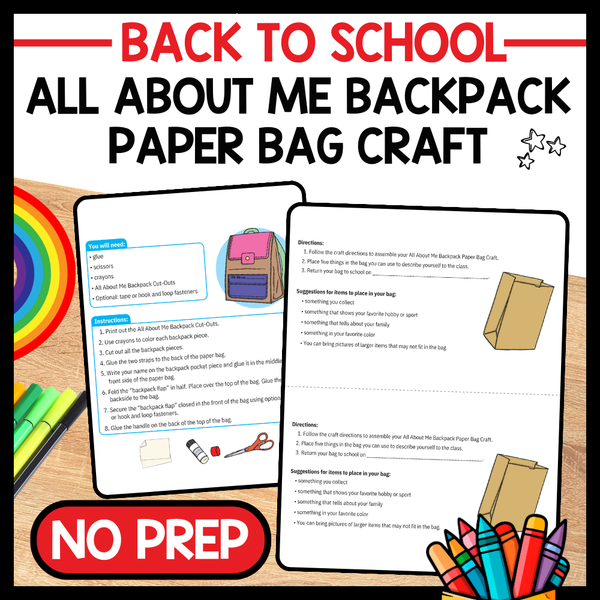 - Assemble the Craft: By assembling their backpack paper bags, students will practice fine motor skills and following directions.
