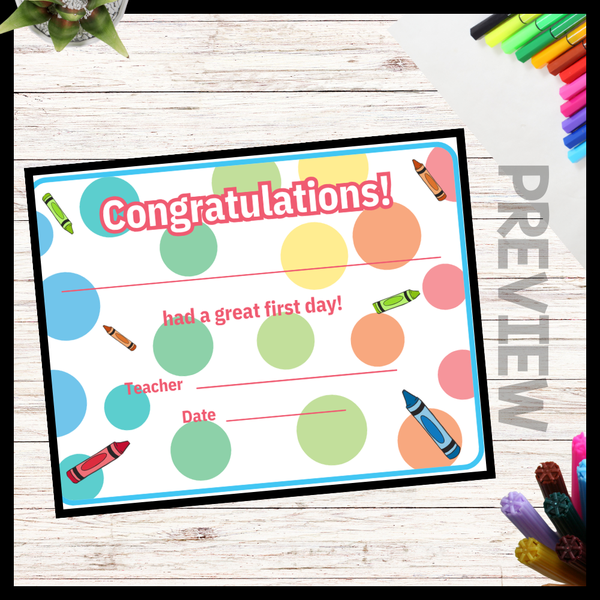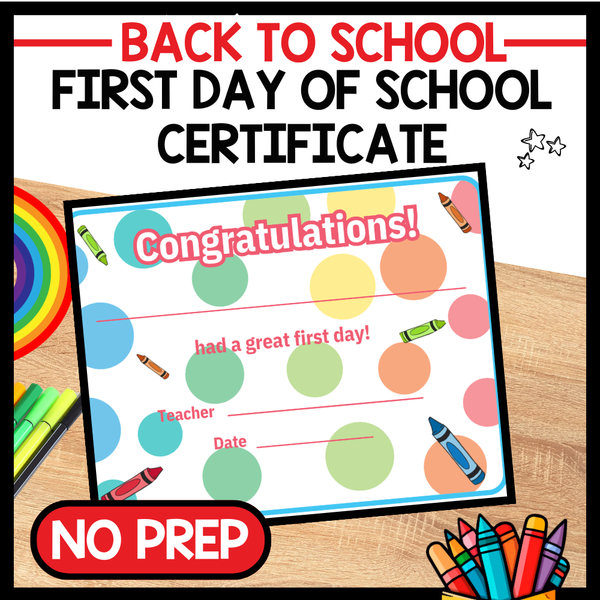 Congratulations are in order this back-to-school season! Celebrate your students' first day of PreK, kindergarten, or first grade with this colorful First Day of School Certificate!