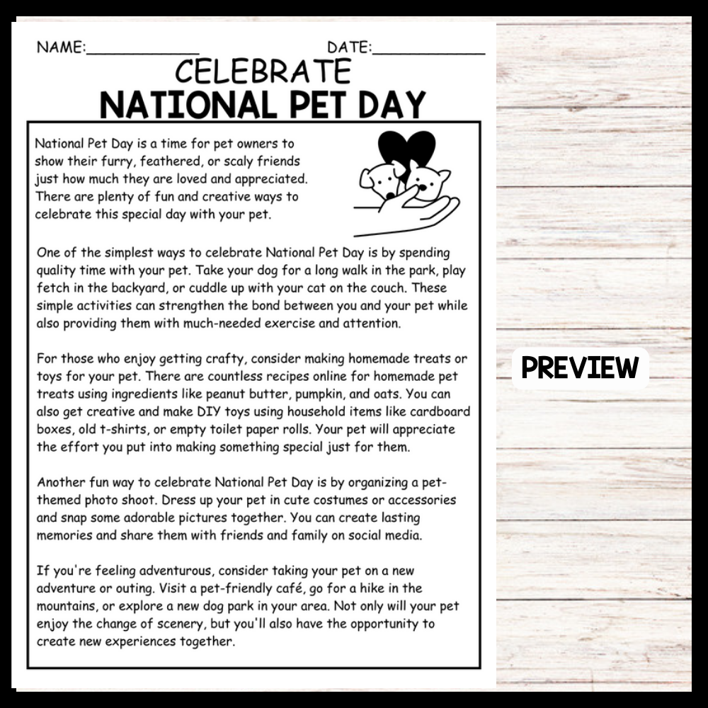 - "CARE OF PETS" NATIONAL PET DAY Reading Comprehension