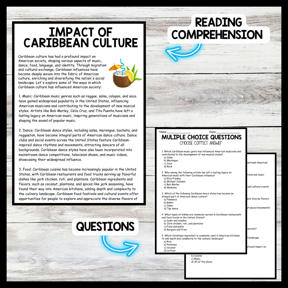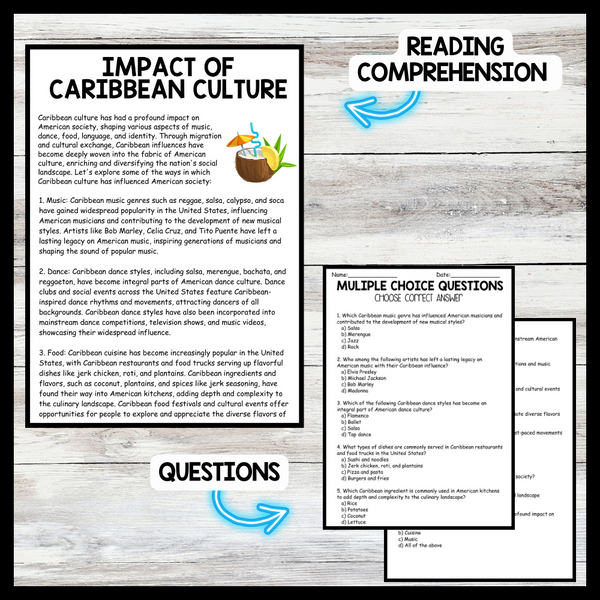 Grow your students knowledge with this Nonfiction Reading Comprehension Passage - Caribbean Heritage Month - Impact of Caribbean Culture   These reading practice passages are perfect for: warm-up, bell work, homework, or weekly assessments. Students can use independently in literacy groups,...View more