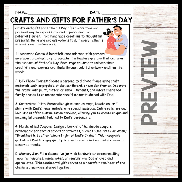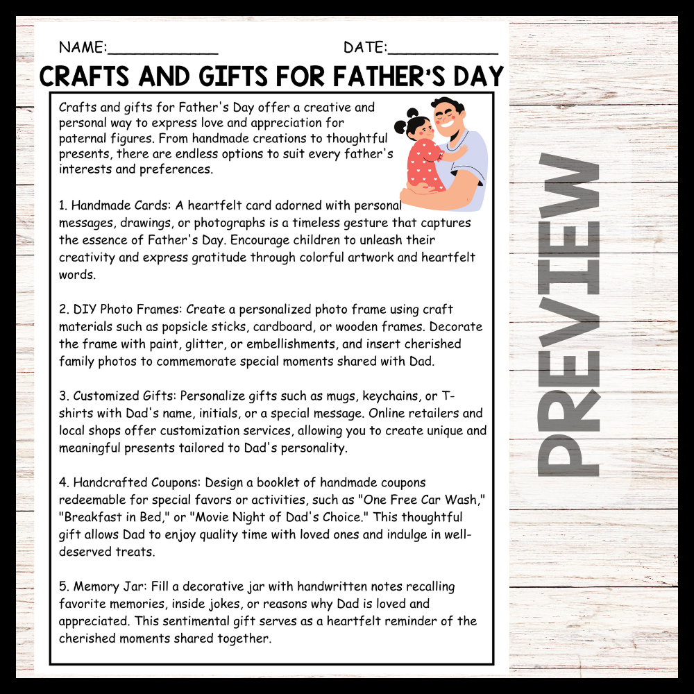 - "CRAFTS AND GIFTS FOR FATHER'S DAY" FATHER'S DAY Reading Comprehension