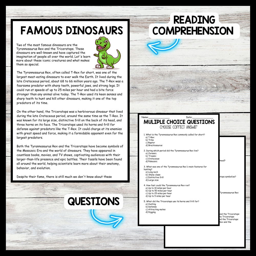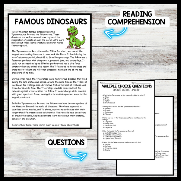 Dinosaur Day - Famous Dinosaurs Reading comprehension Passage and Questions