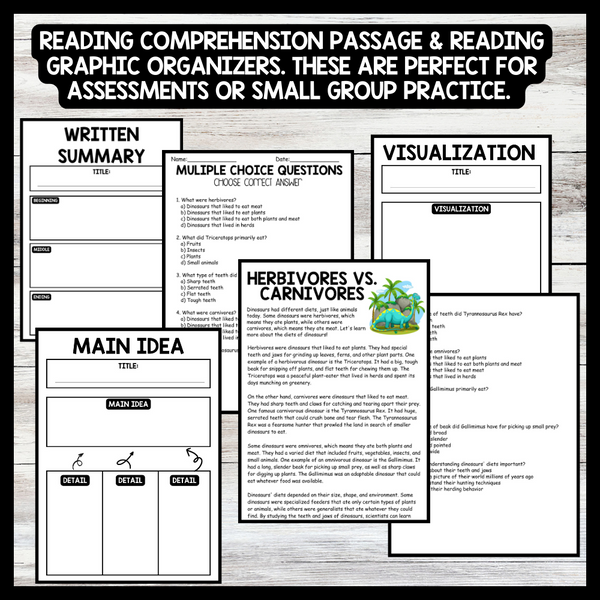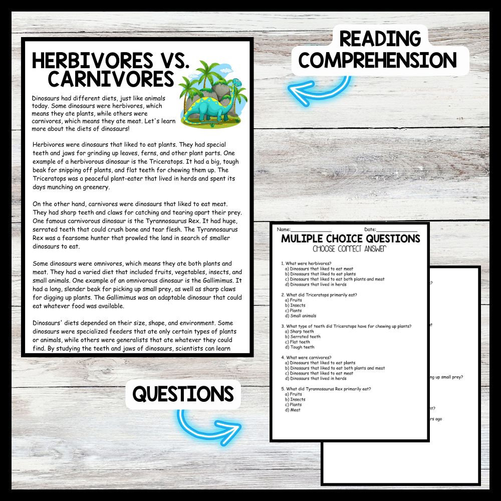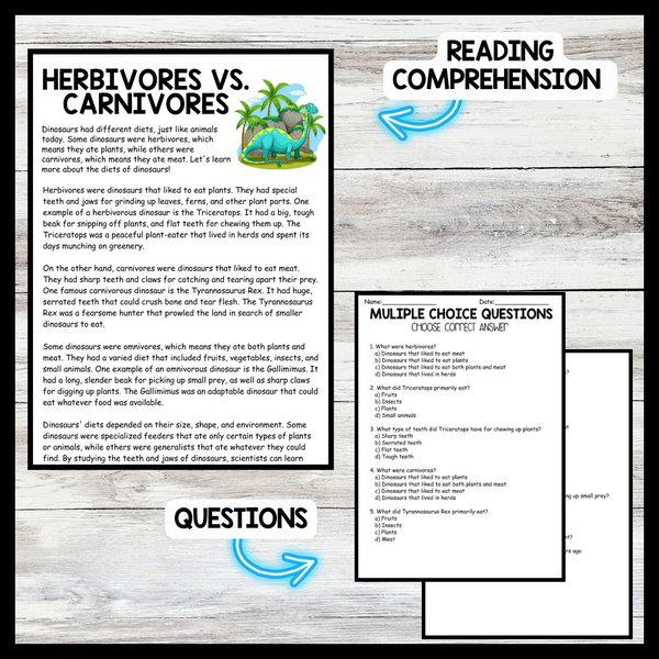Grow your students knowledge with this Nonfiction Reading Comprehension Passage - Dinosaur Day - Herbivores vs. Carnivores