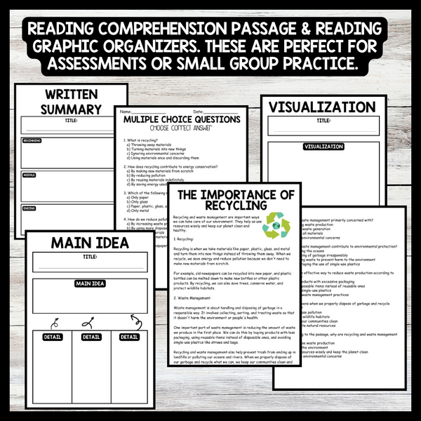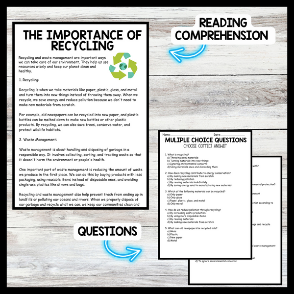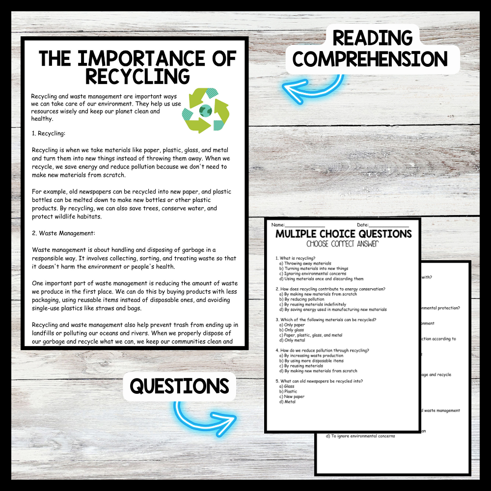 Grow your students knowledge with this Nonfiction Reading Comprehension Passage - Environment  Day - Importance of Recycling   These reading practice passages are perfect for: warm-up, bell work, homework, or weekly assessments. Students can use independently in literacy groups, guided reading...View more