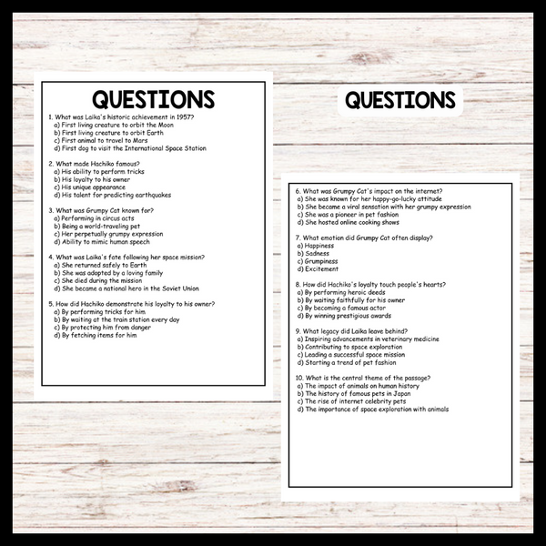 This passage highlights famous pets like Laika, the Soviet space dog, Hachiko, the loyal Akita from Japan, and Grumpy Cat, an internet sensation. These pets have left a lasting impact by inspiring scientific advancements, demonstrating loyalty, and bringing joy to many. Teachers can use this passage to discuss the significant roles animals play in history and our lives, making it easy for students to appreciate the profound connections between humans and pets.
