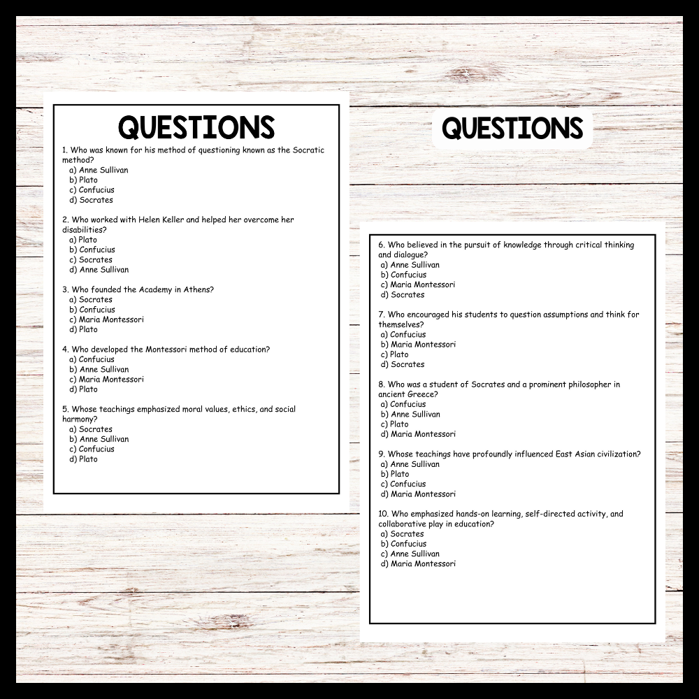 This passage highlights the contributions of renowned educators and philosophers, including Socrates, Anne Sullivan, Plato, and Maria Montessori. It outlines their innovative teaching methods and lasting impact on education, providing students with inspirational examples of transformative educational approaches.