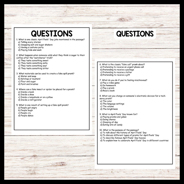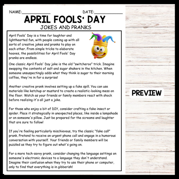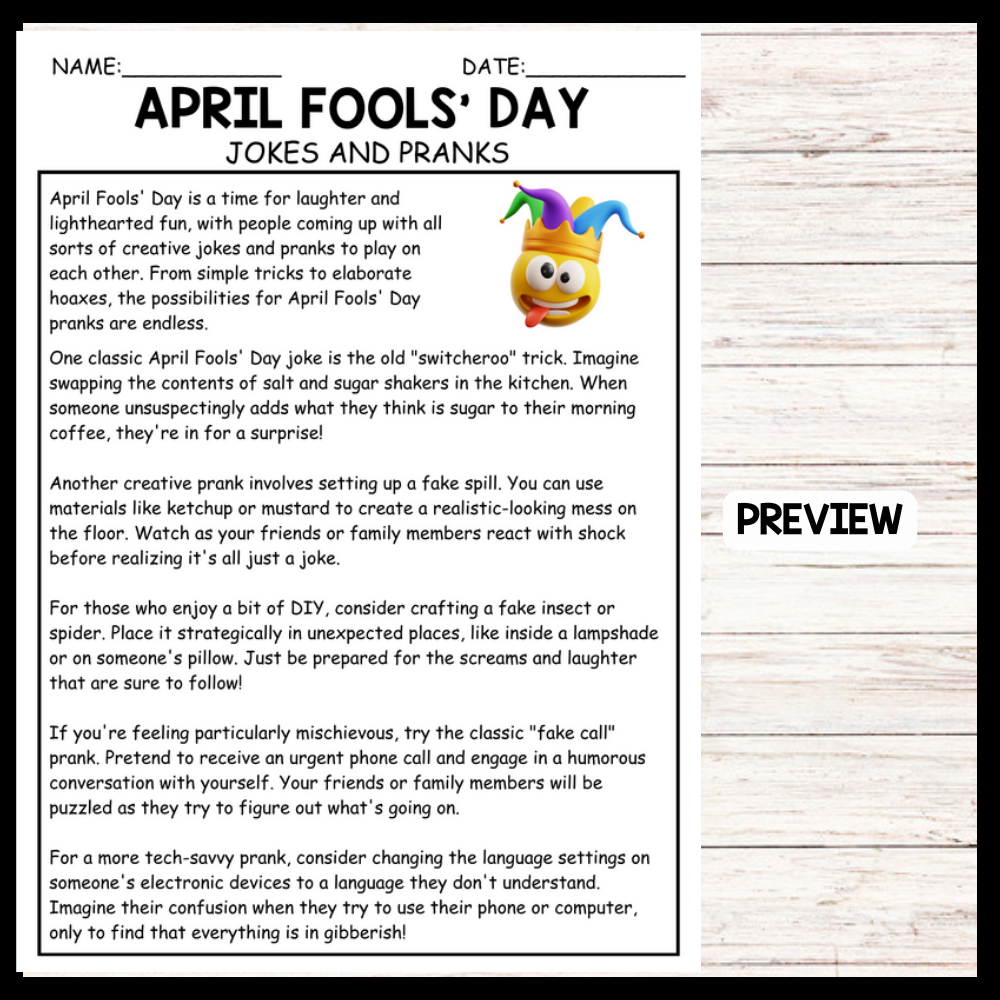 - "JOKES AND PRANKS" APRIL FOOLS' DAY Reading Comprehension