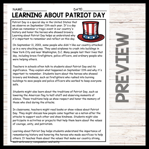 - Learning About Patriot Day Reading comprehension and Questions