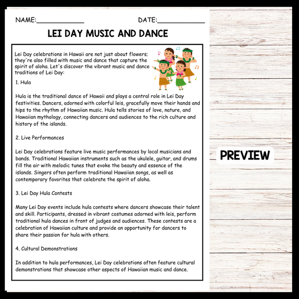 - "LEI DAY MUSIC AND DANCE" LEI DAY Reading Comprehension