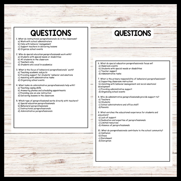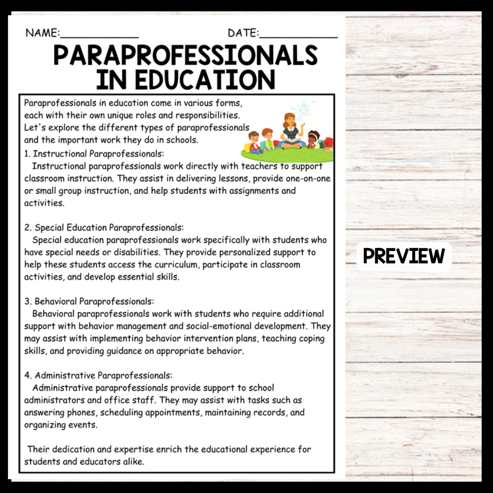 This passage outlines the roles of various paraprofessionals in schools, such as instructional, special education, behavioral, and administrative aides. It's helpful for teachers to use in class as it clearly explains these roles, making it easy for students to understand the diverse support staff in their educational environment.