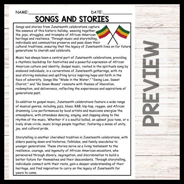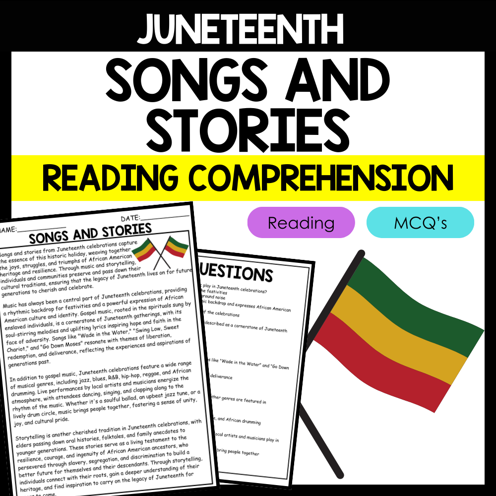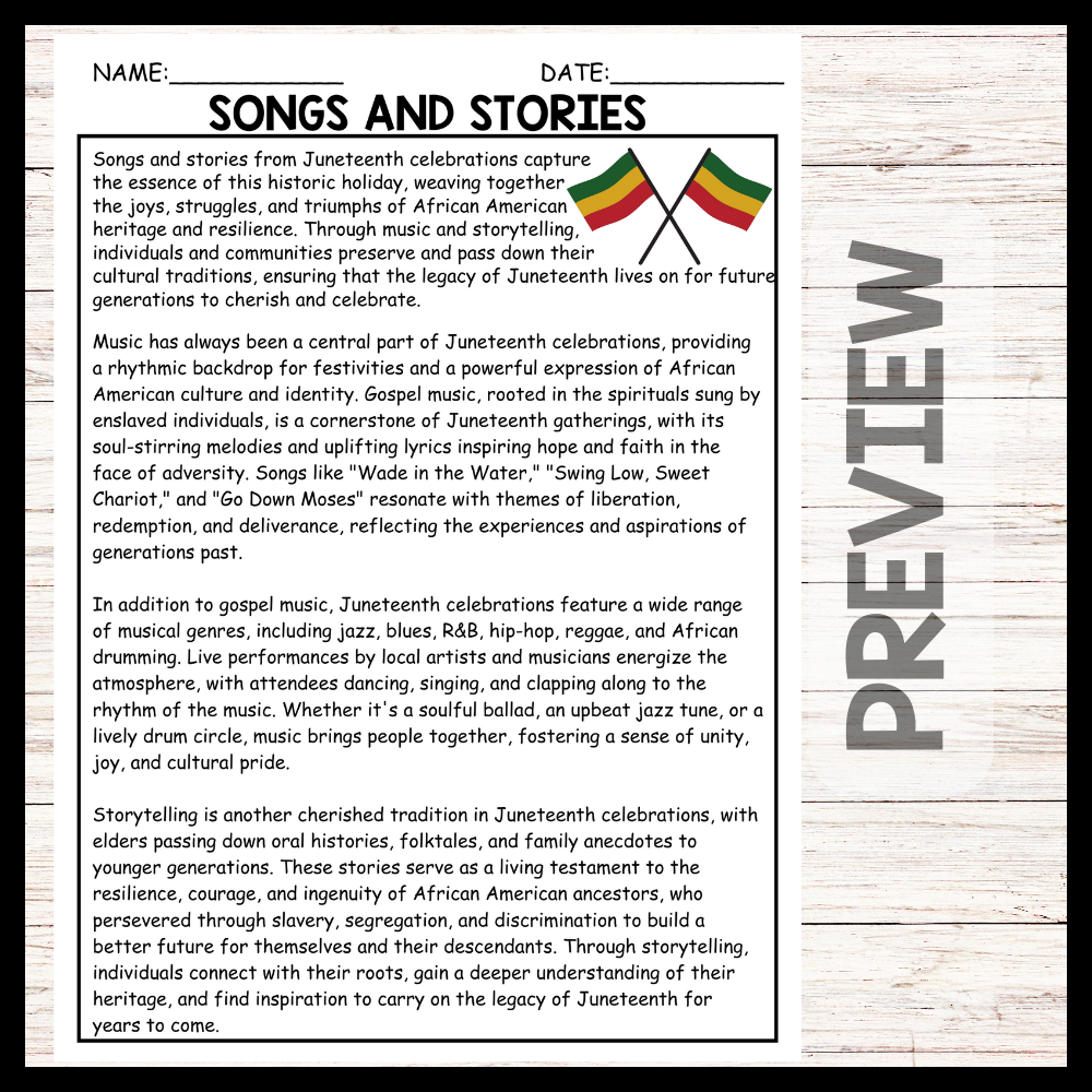 - "SONGS AND STORIES" JUNETEENTH Reading Comprehension