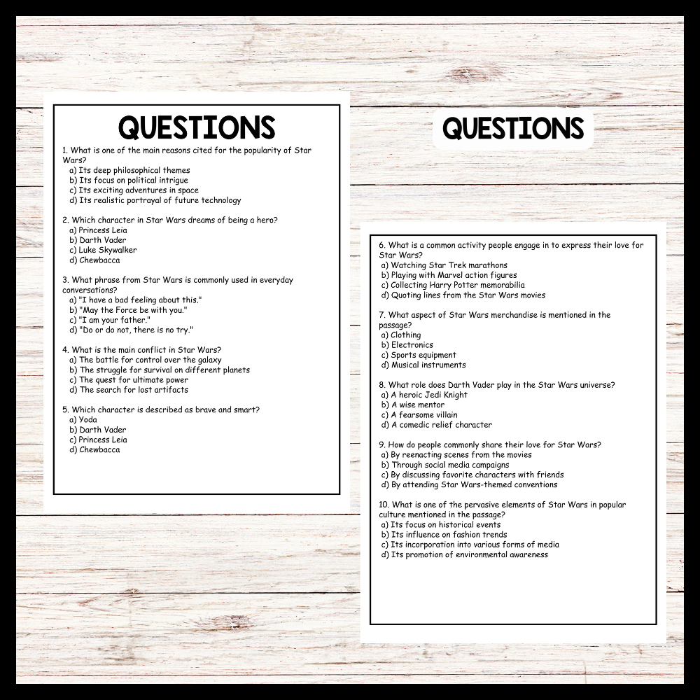 This reading passage explains the popularity of Star Wars, highlighting its thrilling space adventures, memorable characters like Luke Skywalker, Princess Leia, and Darth Vader, and its impact on popular culture. It mentions how people enjoy using quotes from the movies and sharing their love for Star Wars in various ways. Teachers can use this passage in class because it offers a simple and engaging explanation of why Star Wars captivates audiences, making it easy for students to understand its widespread appeal.