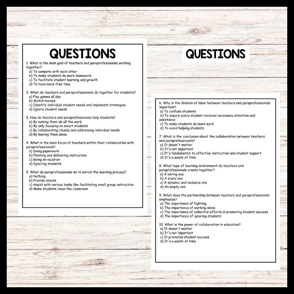 This passage emphasizes the close collaboration between teachers and paraprofessionals in facilitating student learning and growth. It explains how they work together to identify and address individual student needs, maximizing success and creating a cohesive learning environment. Teachers primarily focus on instruction while paraprofessionals provide essential support, ensuring every student receives attention and assistance. Teachers can use this passage to illustrate the importance of teamwork and collaboration in education, helping students understand how collective efforts contribute to their academic and social development.