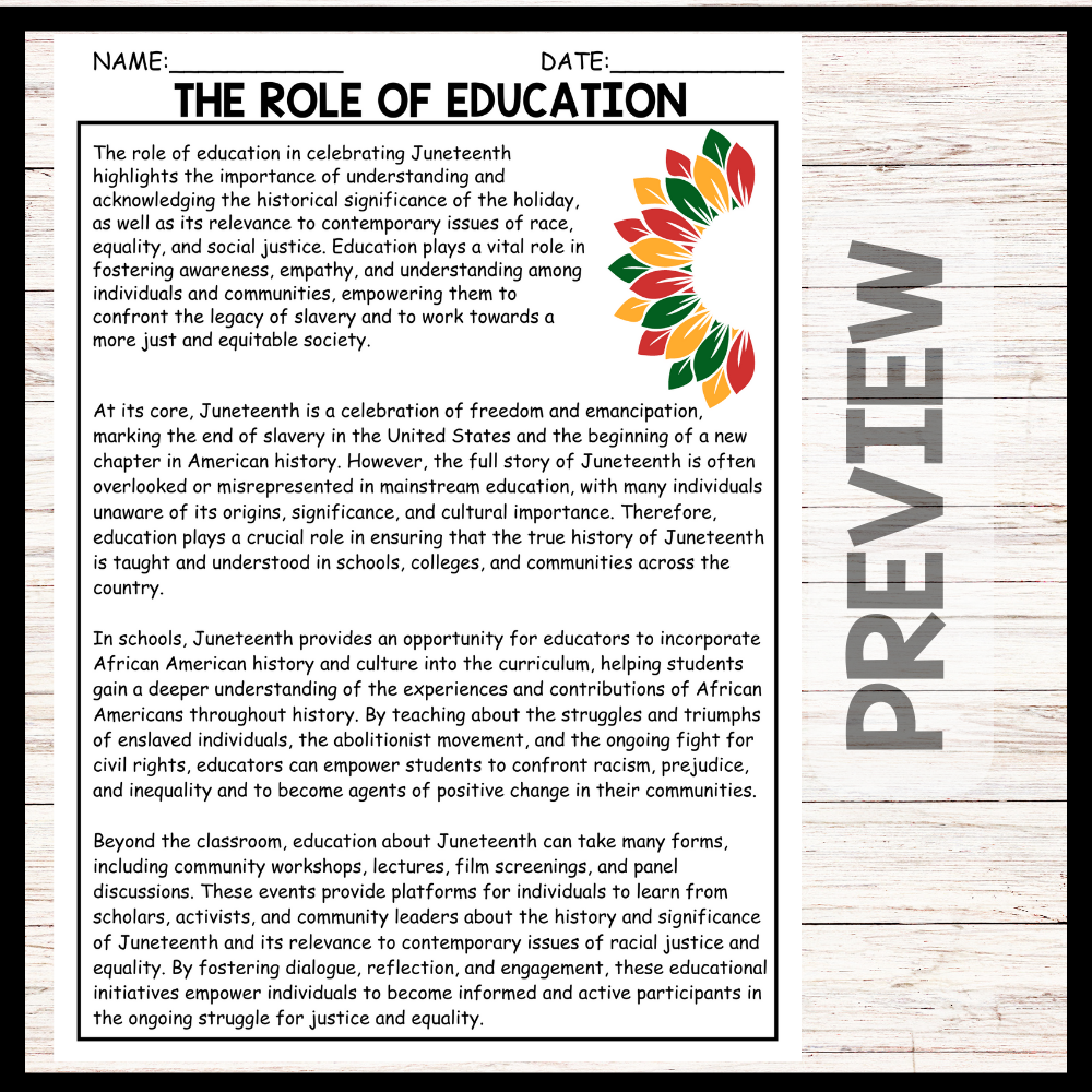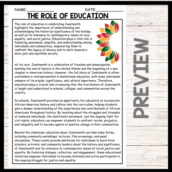 - "THE ROLE OF EDUCATION" JUNETEENTH Reading Comprehension