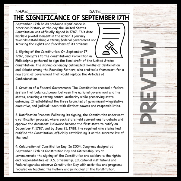 This passage provides teachers with a concise yet comprehensive overview of key historical events surrounding the signing and ratification of the United States Constitution. It highlights the significance of September 17, 1787, as the culmination of months of deliberation and debate among the Founding Fathers in Philadelphia. For educators, it serves as a foundational narrative to illustrate how the Constitution created a federal system of government that balanced national and state powers through its three branches: legislative, executive, and judicial.