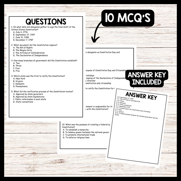 By discussing the ratification process, teachers can show students how each state debated and ultimately approved the Constitution, emphasizing the diverse perspectives and compromises that shaped its adoption. Furthermore, the establishment of Constitution Day in 2004 underscores the ongoing importance of this historic document in American civic life, encouraging students to reflect on their rights and responsibilities as citizens. Overall, this passage equips educators with essential historical context and themes to engage students in discussions about the origins, significance, and enduring legacy of the U.S. Constitution in shaping American democracy.