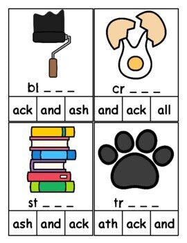 - The first set of cards have the picture with the beginning sound or blend for the at word and students must clip the correct word family ending to complete the word. For example, the card will have a picture of a hat with h _ _ under the picture. The choices the student will choose from will be like at, ag or am.