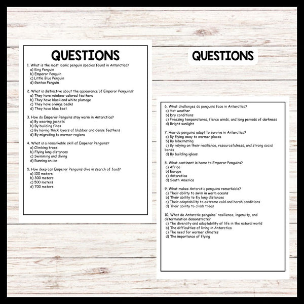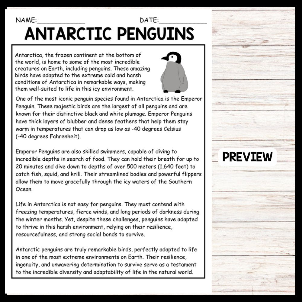 Emperor Penguins, the largest penguin species in Antarctica, are renowned for their striking black and white plumage and incredible adaptations to extreme cold. They can dive over 500 meters deep and hold their breath for up to 20 minutes to catch fish, squid, and krill. Despite facing harsh conditions, Emperor Penguins thrive in Antarctica through resilience and strong social bonds. This passage provides an engaging and informative overview for teachers to introduce students to the remarkable adaptations and survival strategies of Emperor Penguins in one of Earth's most extreme environments.