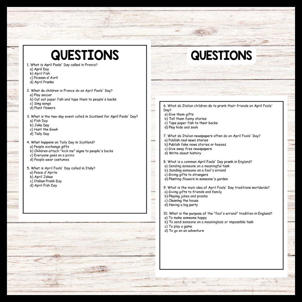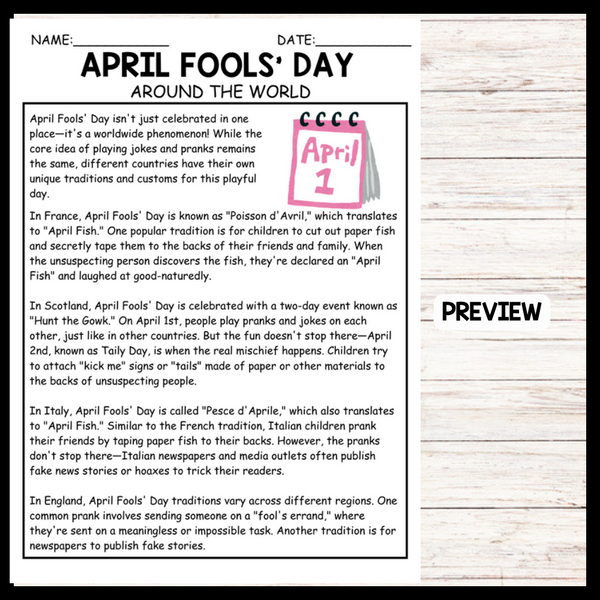 This passage describes various April Fools' Day traditions around the world, highlighting the unique ways people celebrate this day with pranks and jokes. In France and Italy, children tape paper fish to unsuspecting people's backs. Scotland extends the fun with a second day of pranks called "Taily Day," and in England, people might be sent on fool's errands or fooled by fake news stories. This passage is helpful for teachers as it provides a fun and engaging way to introduce students to cultural differences and similarities in holiday celebrations.