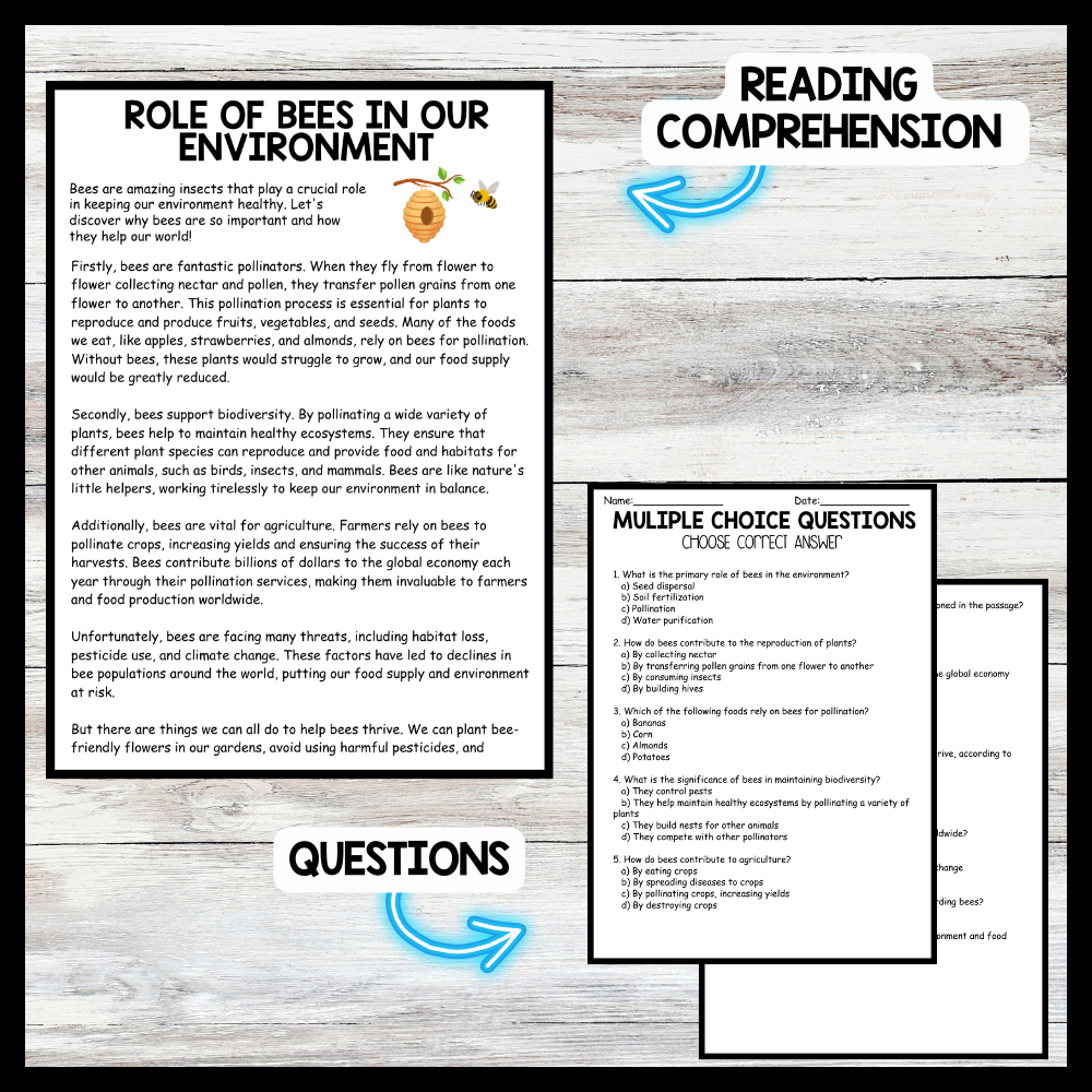 Bee Day - Bees in Our Environment Reading comprehension Passage and Questions