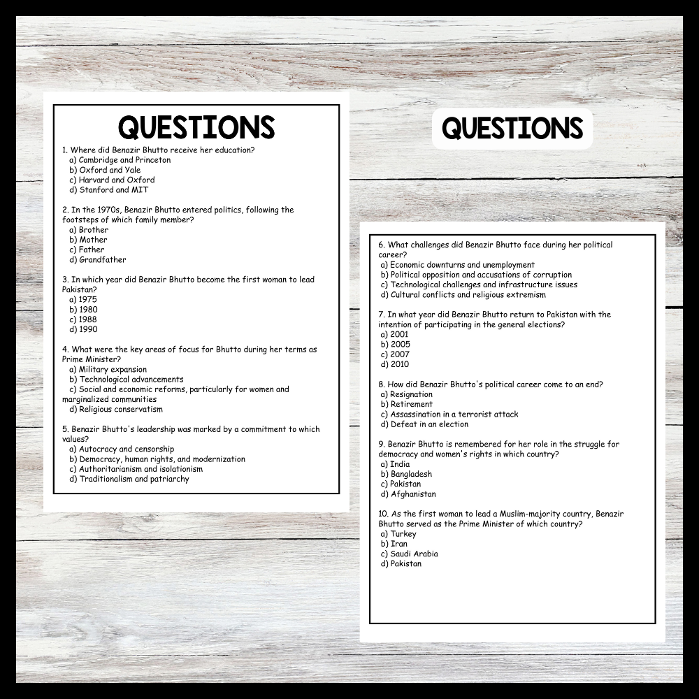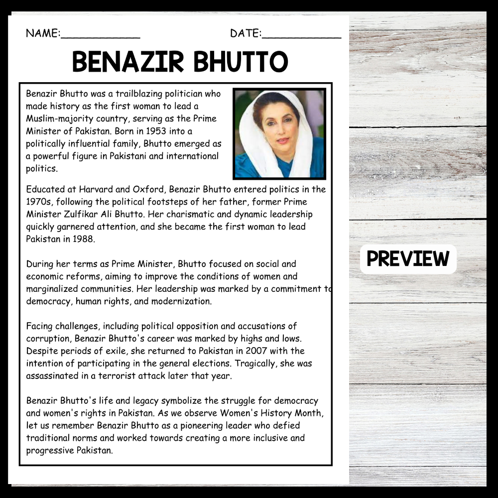 This passage outlines Benazir Bhutto's journey from her education at Harvard and Oxford to becoming Pakistan's first female Prime Minister in 1988. It highlights her focus on social and economic reforms, commitment to democracy, and advocacy for women's and marginalized communities' rights. Despite facing political challenges and periods of exile, Bhutto's legacy as a leader striving for democracy and women's rights in Pakistan endures. This summary is beneficial for teachers as it provides a clear and concise overview of Bhutto's significant contributions, making it an inspiring addition to Women's History Month discussions.