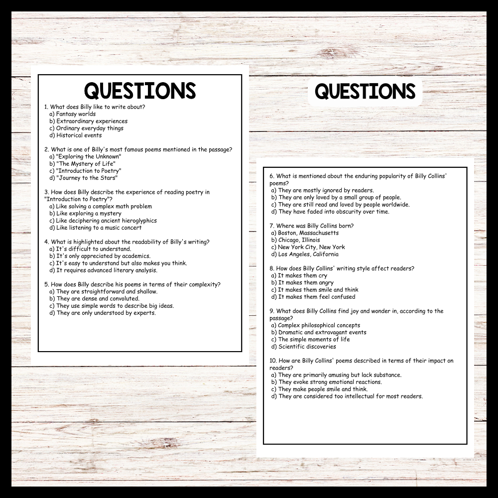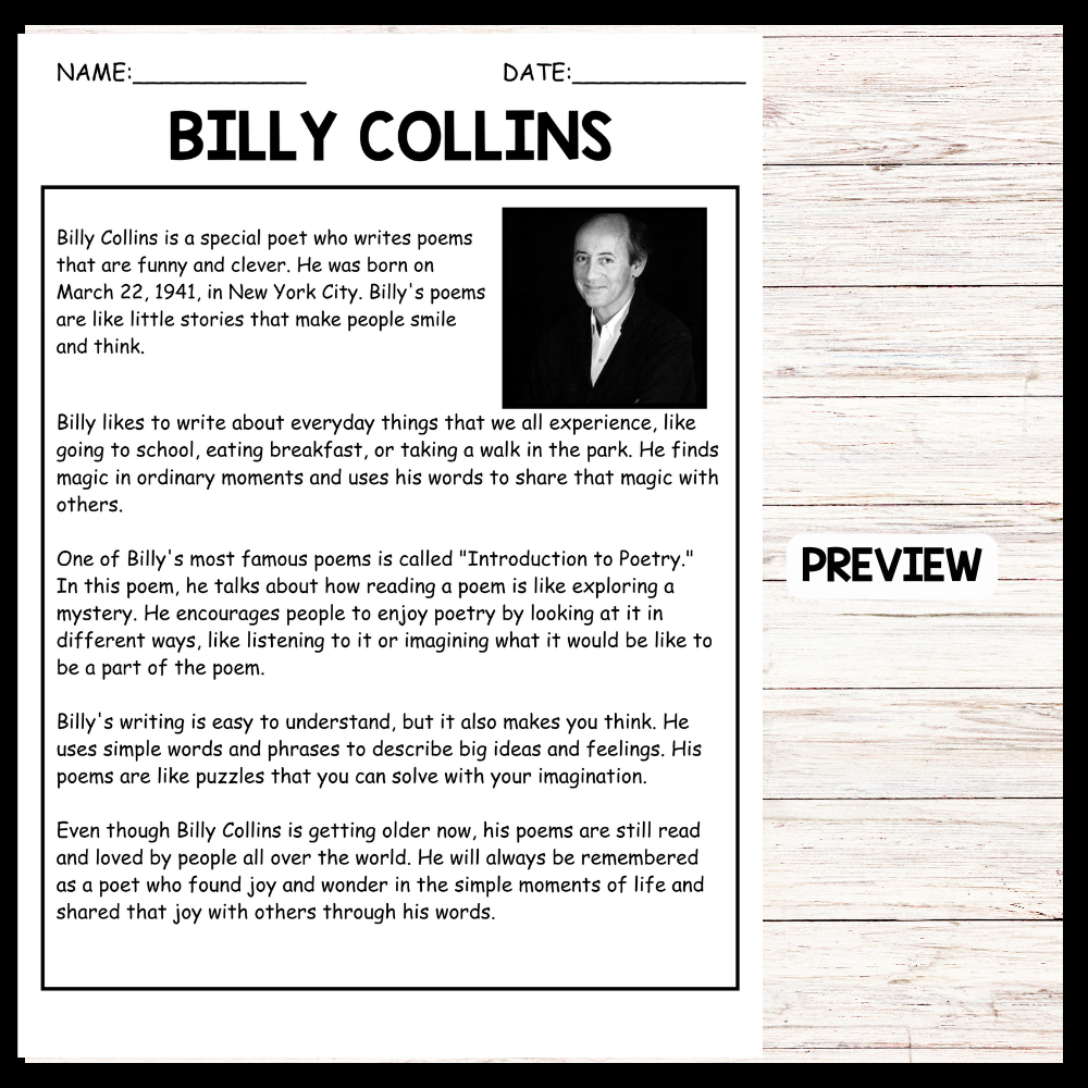 This passage introduces Billy Collins, a celebrated poet known for finding magic in everyday experiences and illuminating the beauty of the mundane. His renowned poem "Introduction to Poetry" encourages readers to explore poetry's mystery and depth with imagination and multiple perspectives. This overview is helpful for teachers as it highlights Collins's accessible language and profound ideas, making his poetry a captivating and enriching experience for students. His ability to evoke joy and contemplation ensures his continued popularity and relevance.