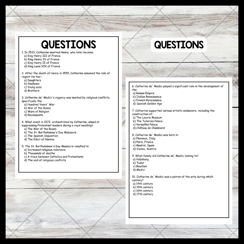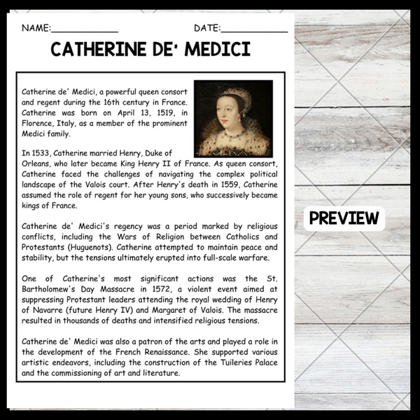 In 1533, Catherine de' Medici married Henry, Duke of Orleans, who later became King Henry II of France. As queen consort, Catherine navigated the complex political landscape of the Valois court. After Henry's death in 1559, she became regent for her young sons, who successively became kings of France. Her regency was marked by religious conflicts, including the Wars of Religion between Catholics and Protestants (Huguenots). Despite her attempts to maintain peace, tensions escalated into full-scale warfare, culminating in the St. Bartholomew's Day Massacre in 1572, which saw thousands of Protestant leaders killed. Catherine was also a patron of the arts, contributing to the French Renaissance through projects like the Tuileries Palace and various artistic commissions.