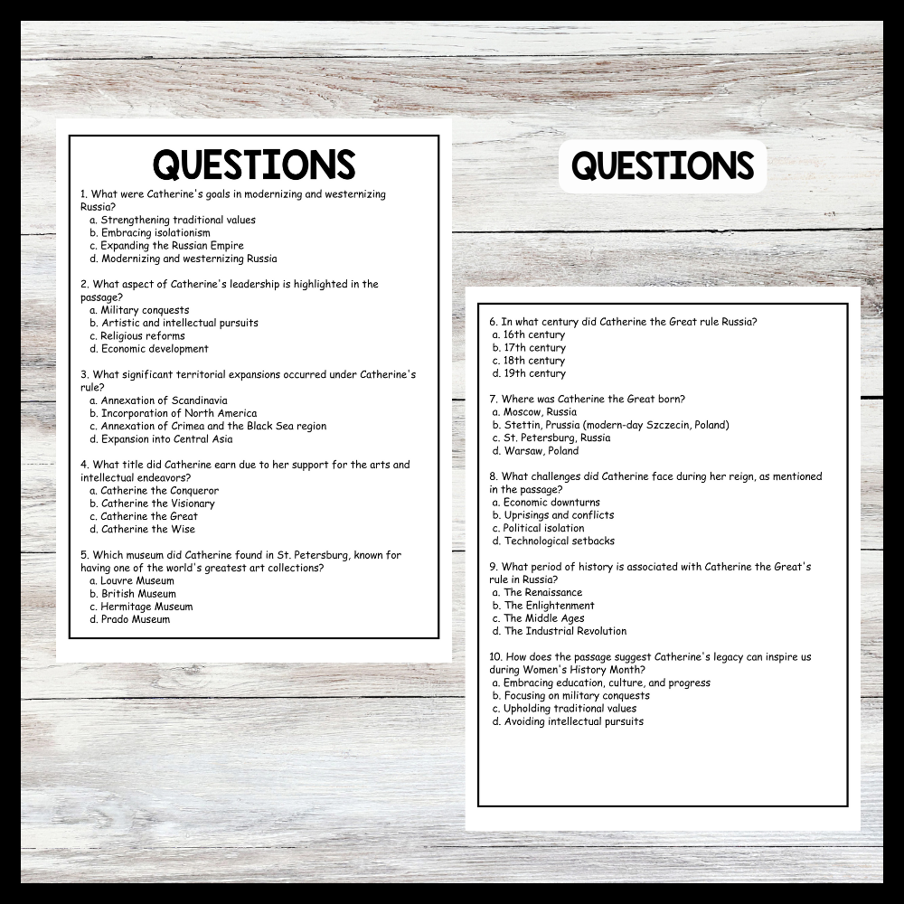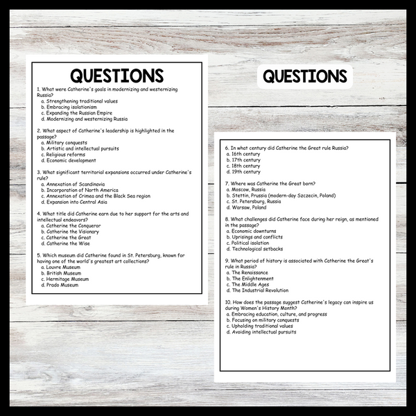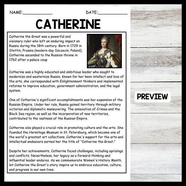This passage highlights Catherine the Great's efforts to modernize and westernize Russia, emphasizing her intellectual pursuits and love for the arts. It details her significant accomplishments, including expanding the Russian Empire through military and diplomatic efforts and founding the Hermitage Museum. Despite facing challenges, Catherine's legacy as a progressive and influential leader endures. This summary is helpful for teachers as it provides an accessible overview of Catherine the Great's contributions, making it an inspiring addition to discussions during Women's History Month.