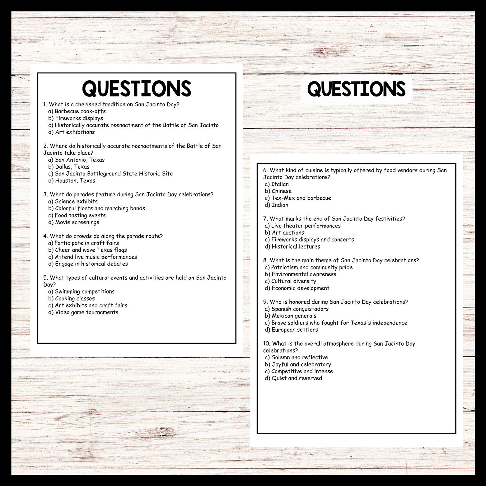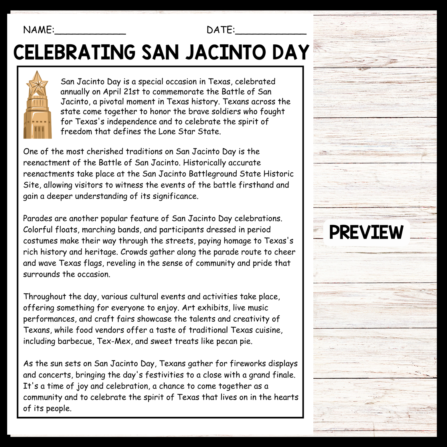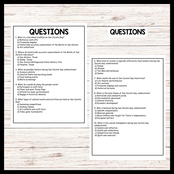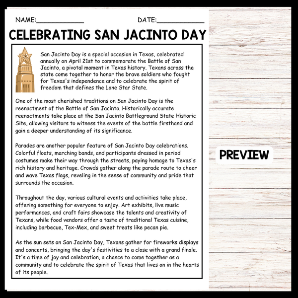 The passage highlights the cherished traditions associated with San Jacinto Day celebrations, focusing on the reenactment of the Battle of San Jacinto and parades as central events. It also mentions various cultural activities such as art exhibits, music performances, and food vendors that contribute to the festive atmosphere. Teachers can use this passage to educate students about the historical significance of San Jacinto Day and its importance in Texas culture, while also emphasizing the sense of community and pride that characterizes the celebrations.